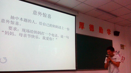 活动开始,班长黄莹收集了全班同学想对自己妈妈说的话,然后以抽签的形式选出五位同学,通过看图演讲、串词演讲、视频演讲等多种方式现场分享与母亲的故事、表达自己对妈妈的爱。看着被抽中上台的同学向自己的妈妈表达着最真挚的祝福,同学们也不由自主的拿出手机,为妈妈送去关心和祝福。