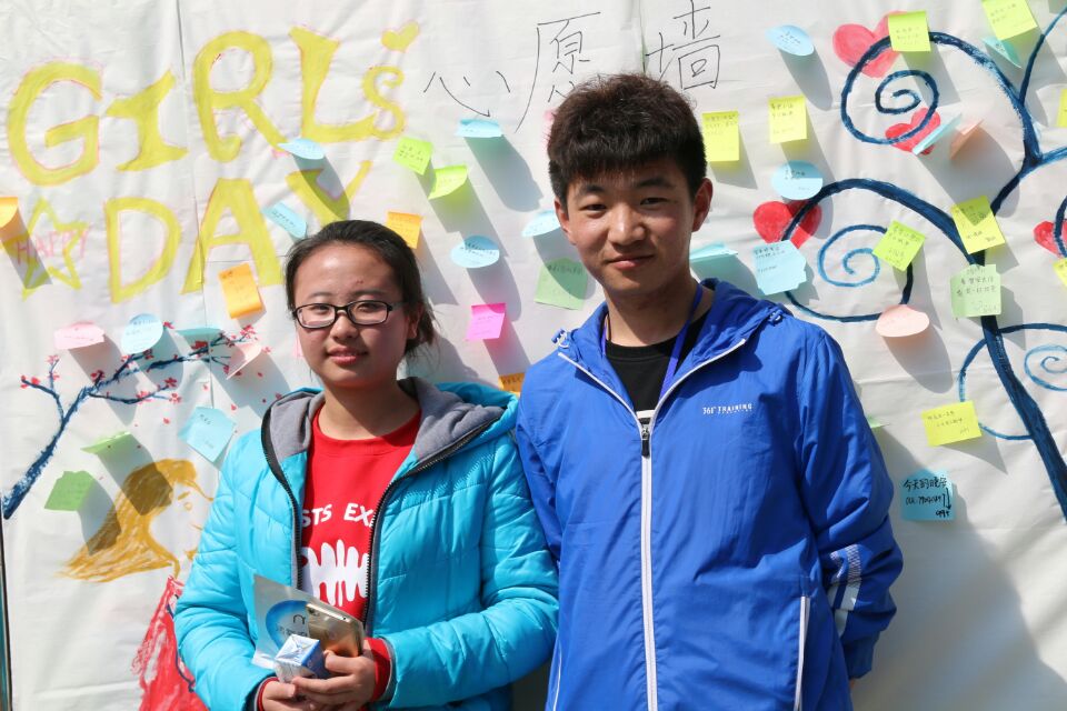 路过的男生也纷纷翻看墙上的贴纸,摘下一个,准备帮助可爱的女神们实现愿望。活动现场第一个愿望实现的女生一脸开心地与他的好朋友合影。