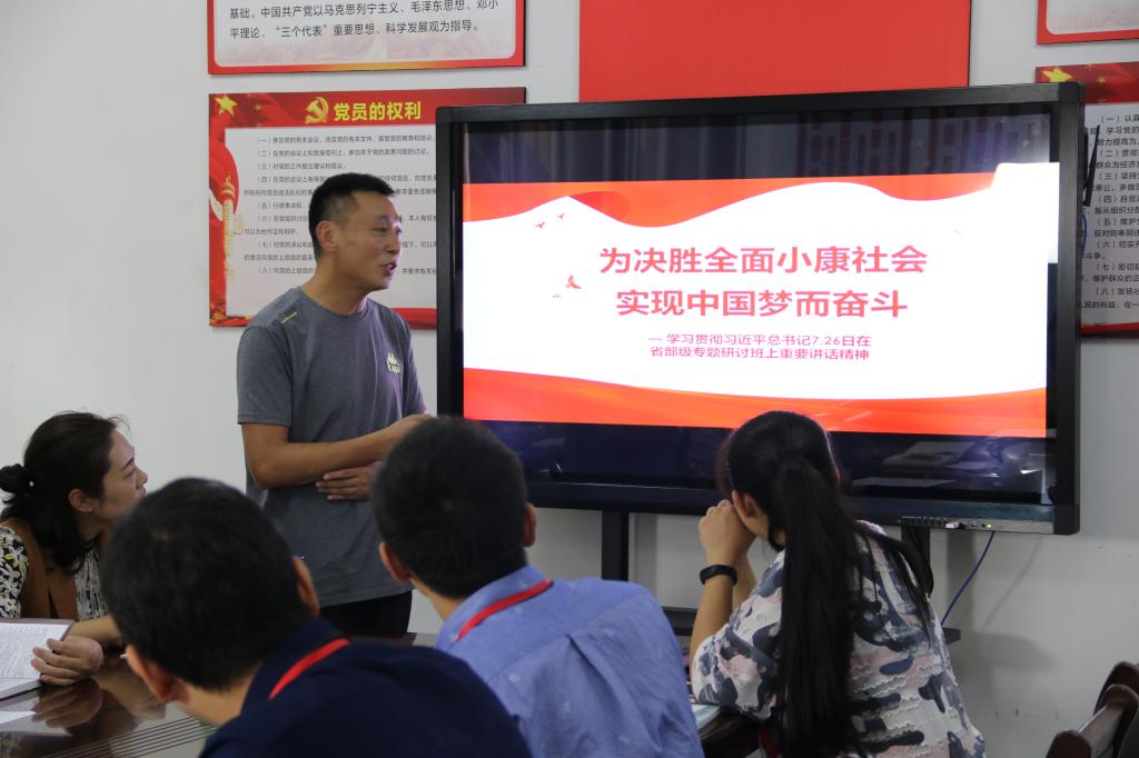 会议开始,全体与会党员学习9月党建工作重点及9月主题党日活动通知,由分党委书记王建平主持讲学了《7.26重要讲话精神》专题党课——“为决胜全面小康社会实现中国梦而奋斗”。随后,全体党员集中学习了关于贯彻《建立健全惩治和预防腐败体系2013-工作规划》实施办法以及十堰市冲刺全国文明城市责任追究办法。